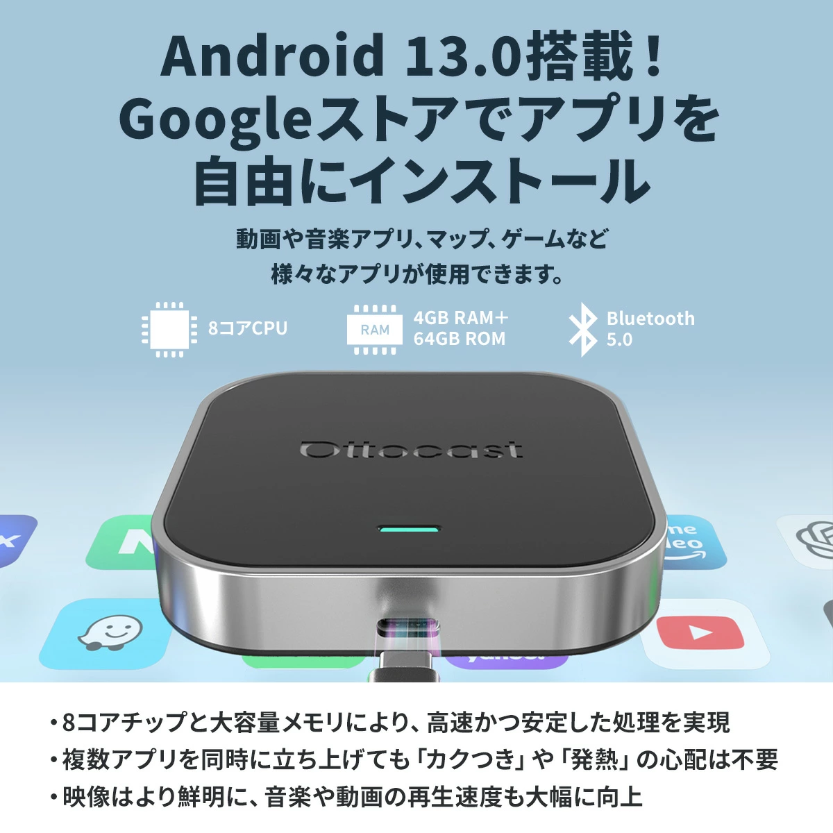 また、Android OSベース(Android 13+OttoDrive 2.5)で動作し、ナビ・音楽・動画アプリなどを車載画面上で操作できます。ユーザーはUSB接続だけでアプリを利用したりワイヤレス接続設定をおこなったりすることができ、スマートフォン機能を無線で車載システムに表示・操作できます。