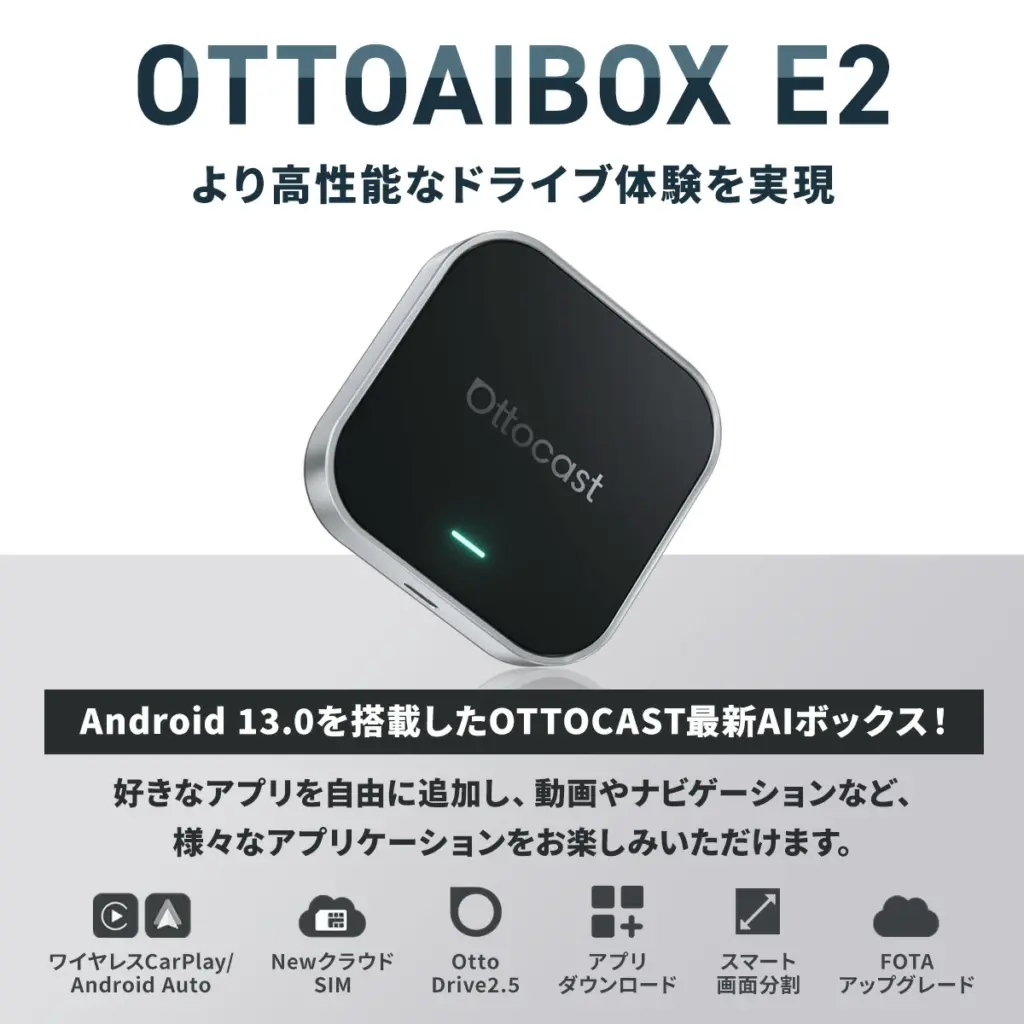 OTTOAIBOX E2は、純正の有線Apple CarPlay/Android Autoに対応した車載ナビ画面をワイヤレス化し、車内エンターテインメント機能を拡張するAI Boxデバイスです。本体に4GB RAM + 64GBストレージを搭載し、USBポートに接続するだけでシステムのスマート化を実現します。