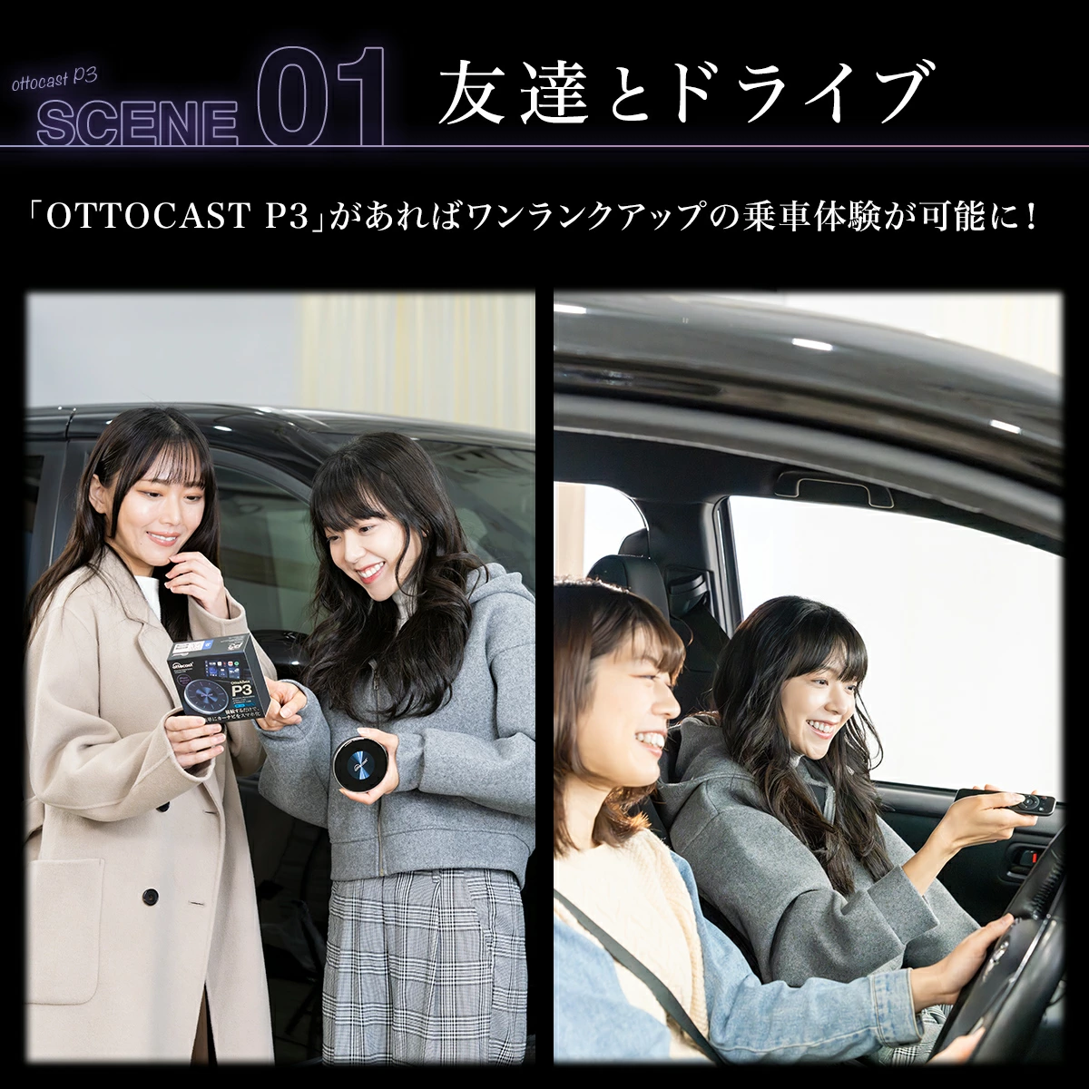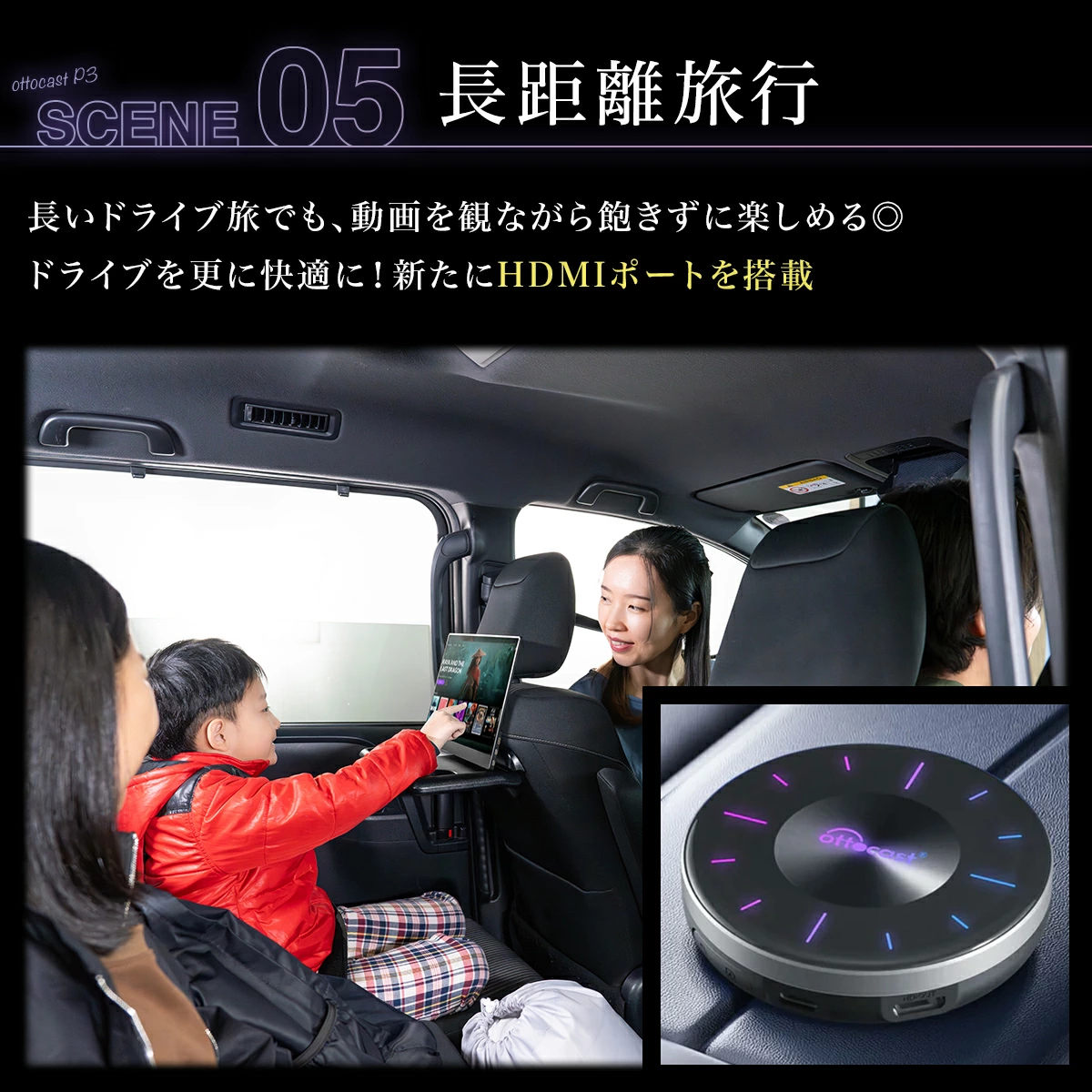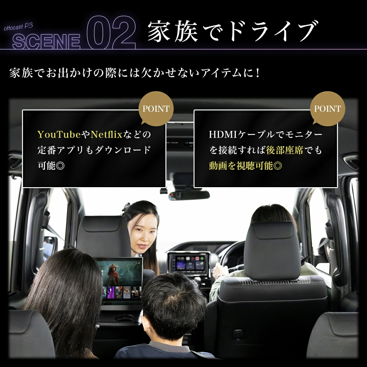 ナビやモニターでYouTubeやNetflixを楽しめる家族のドライブをもっと楽しくOTTOCASTシリーズ【日本正規モデル】 定番アプリが使い放題YouTubeもNetflixも、インストールし放題 画面分割でナビを使い分け運転席はマップ、助手席は動画を楽しめる OTTOCASTシリーズは、日本正規代理店として商人屋が正規モデルを販売し、日本人による丁寧なアフターサポートを提供しています。 該当する商品ラインナップ 【正規モデル】OTTOAIBOX E2OTTOAIBOX E2は、純正の有線Apple CarPlay/Android Autoに対応した車載ナビ画面をワイヤレス化 し、車内エンターテインメント機能を拡張する AI Box デバイス です。本体に4GB RAM + 64GBストレージを搭載し、USBポートに接続するだけでシステムのスマート化を実現します。 Amazonで購入 楽天で購入 Yahoo!で購入 商品詳細ページへ 【正規モデル】OTTOCAST P3 ProOTTOAIBOX P3 Proは、Apple CarPlayまたはAndroid Autoに対応した車両に接続することで、車載ディスプレイ上でAndroid OSを起動し、各種アプリを直接操作できる車載用AI Boxです。スマートフォンの画面をミラーリングする仕組みではなく、本体自体がAndroidデバイスとして動作します。 Amazonで購入 楽天で購入 Yahoo!で購入 商品詳細ページへ 【正規モデル】OTTOCAST Nano【最新モデルOttocast Nano】次世代AI BOX「Ottocast Nano」が登場!音声制御が可能で、運転中でも安全に操作が可能です。AIはまるで人と話しているような自然な応答で、会話型AIをお楽しみいただけます。 Amazonで購入 楽天で購入 Yahoo!で購入 商品詳細ページへ 【正規モデル】OTTOCAST P3車のナビでスマホのアプリが利用でき、YouTube・NetFlixなど動画視聴アプリはもちろん、Spotifyなどの音楽ストリーミングアプリも使用できるオットキャストが、より洗練されたデザインで更に使いやすくなりました。 Amazonで購入 楽天で購入 Yahoo!で購入 商品詳細ページへ 【正規モデル】Ottocast Screen AI【大画面車載ディスプレイOttocast screen】ワイヤレスCarPlay / Android Auto対応、11.4インチの大画面ディスプレイを搭載した車載スマートデバイスです。簡単設置・多機能で、最新のドライブ体験をお楽しみいただけます。 Amazonで購入 楽天で購入 Yahoo!で購入 商品詳細ページへ 【正規モデル】Ottocast ScreenFlow【大画面車載ディスプレイ】ワイヤレスCarPlay / Android Auto対応、11.4インチの大画面ディスプレイを搭載した車載スマートデバイスです。簡単設置・多機能で、最新のドライブ体験をお楽しみいただけます。 Amazonで購入 楽天で購入 Yahoo!で購入 商品詳細ページへ JAPANモビリティショーに出展OTTOCAST正規代理店『商人屋』は、JAPANモビリティショーにてOTTOCASTシリーズ日本正規モデル専用ブースを出展しています。人気車系YouTuberたちの登壇イベントなどを開催し、連日多くのお客様にご来場いただきました。 カーナビがスマホみたいに 友人とのドライブに工事不要の簡単接続。Wi-Fi通信を用意するだけで使用できます。レンタカーやカーシェアにも使える便利なアイテムです。 家族でドライブ家族でのお出かけの際に、お子さんにとって退屈な時間になりかねないドライブ時間を快適にできます。YouTubeやNetflixなど、様々なアプリをダウンロードして使用できます。 カップルでのドライブドライブデートの車内時間をより快適にできます。専用のドライブインシアターのようにご利用ください。 子どもの送り迎えに子どもの送迎やちょっとしたお出かけに、テレビを見るような感覚で車内時間を快適にできます。専用リモコンがあるので、後部座席からでも安全に操作できます。 長距離旅行長い乗車時間や渋滞にハマってしまったときにも、車内で映画や動画を楽しめます。HDMI接続で後部座席のフリップモニタや追加モニタに使用できます。